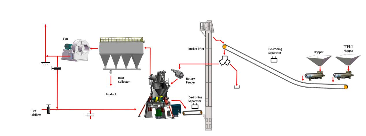 Raw Material Bin -> Feeder -> Vertical Mill -> High-Efficiency Air Classifier -> Pulse Bag Filter -> Finished Product Bin -> Packaging or Bulk