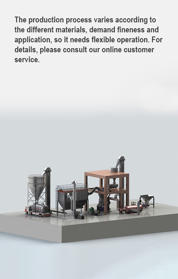 Fine powder complies with the fineness with airflow go through the pipe into the dust collector for separation and collection. The finished powder collected by the delivery device is delivered to the finished product bin, and then packed uniformly with the powder tanker or automatic packing machine.